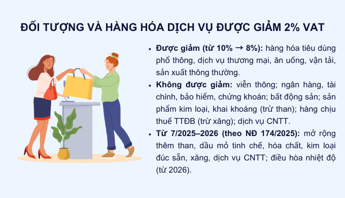 Trong thời gian này, hàng hóa, dịch vụ đang áp dụng thuế suất 10% sẽ được giảm xuống 8%, trừ các nhóm bị loại trừ theo quy định của Chính phủ.