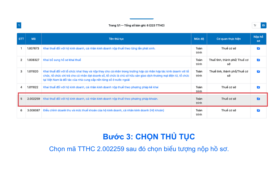 Khi danh sách thủ tục xuất hiện, nhấn biểu tượng Nộp hồ sơ để mở tờ khai.