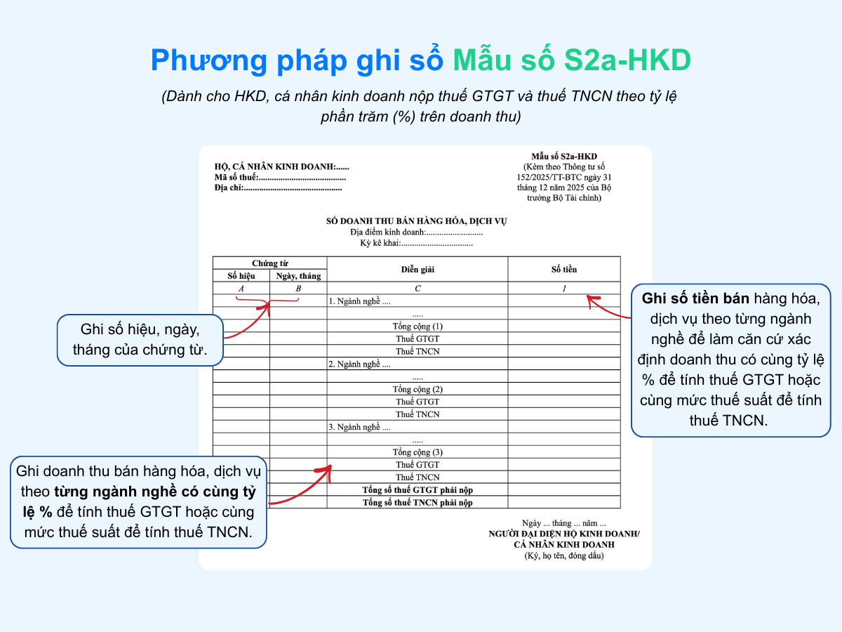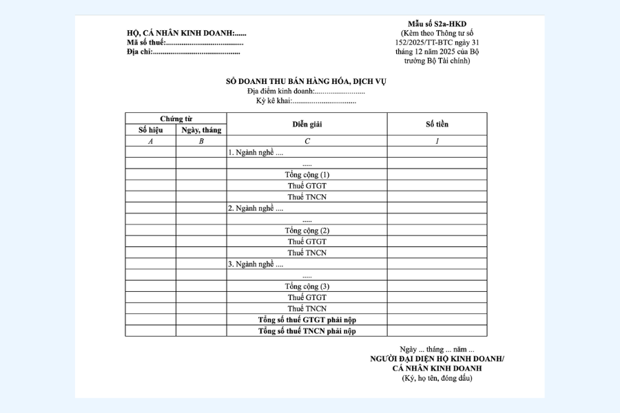 Đối với hộ kinh doanh, cá nhân kinh doanh nộp thuế GTGT và thuế TNCN theo phương pháp tính tỷ lệ (%) trên doanh thu, việc ghi chép sổ sách không chỉ để theo dõi hoạt động kinh doanh mà còn là căn cứ trực tiếp để xác định số thuế phải nộp. Trong đó, Sổ doanh thu bán hàng hóa, dịch vụ – Mẫu số S2a-HKD là mẫu sổ bắt buộc áp dụng theo quy định tại Thông tư 152/2025/TT-BTC của Bộ Tài chính.