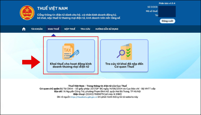Bước 2: Chọn “Khai thuế cho hoạt động kinh doanh thương mại điện tử”