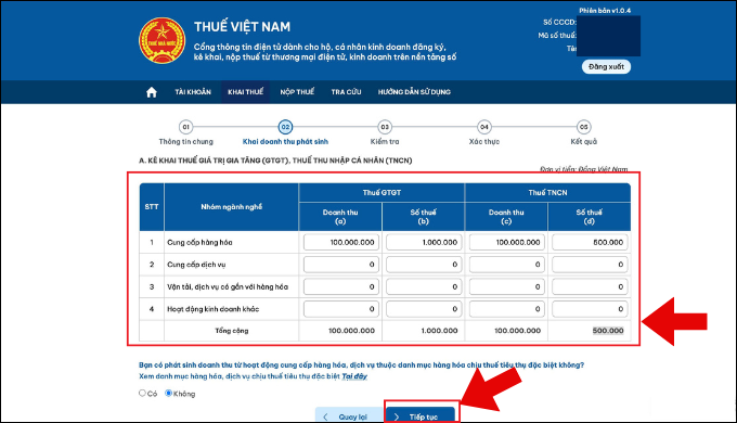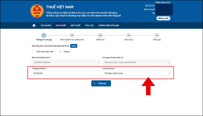 Bước 6: Điền tờ khai > Chọn “Tiếp tục”