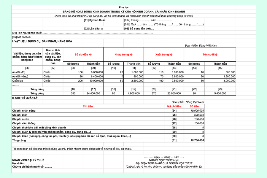 Việc lập đúng và đầy đủ bảng kê 01-2/BK-HĐKD không chỉ giúp hộ kinh doanh tuân thủ quy định pháp luật, mà còn hỗ trợ quản lý dòng tiền, kiểm soát lãi – lỗ hiệu quả hơn trong quá trình kinh doanh.
