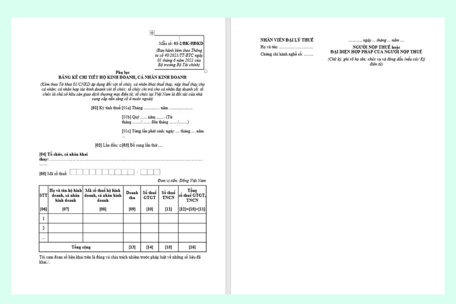 Mẫu 01-2/BK-HĐKD – Bảng kê hoạt động kinh doanh của hộ kinh doanh là một trong những biểu mẫu quan trọng bắt buộc khi hộ kinh doanh thực hiện kê khai thuế theo phương pháp kê khai. Biểu mẫu này được ban hành kèm theo Thông tư 40/2021/TT-BTC của Bộ Tài chính và là căn cứ để cơ quan thuế xác định doanh thu, chi phí, lợi nhuận, từ đó tính thuế GTGT và thuế TNCN phải nộp.