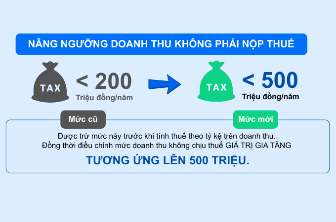 Hộ, cá nhân kinh doanh có doanh thu từ 500 triệu đồng/năm trở xuống sẽ không phải nộp thuế TNCN và thuế GTGT. Phần doanh thu vượt trên 500 triệu mới được tính thuế theo tỷ lệ hoặc theo thu nhập.