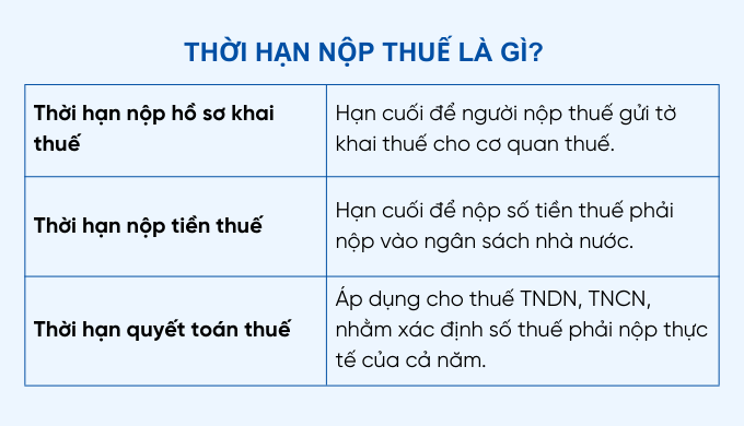 Thời hạn nộp hồ sơ khai thuế: hạn cuối gửi tờ khai cho cơ quan thuế.