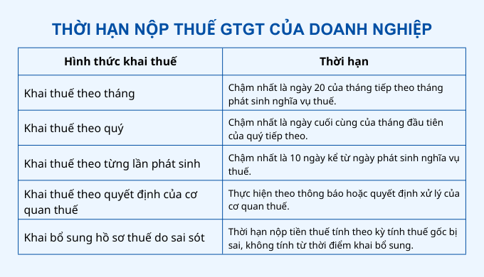 Theo Luật Quản lý thuế 2019, thời hạn nộp thuế GTGT thường trùng với thời hạn nộp hồ sơ khai thuế, trừ khi cơ quan thuế có thông báo riêng.