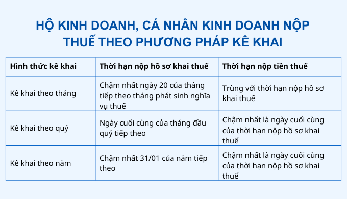 Thời hạn nộp thuế tương ứng theo hình thức khai: tháng, quý, năm hoặc từng lần phát sinh.