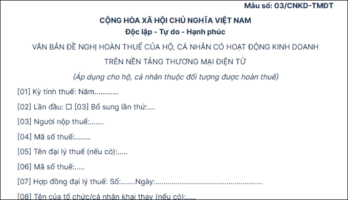 Văn bản đề nghị hoàn thuế theo mẫu số 03/CNKD-TMĐT