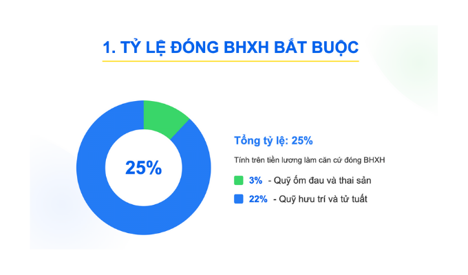 Tổng tỷ lệ đóng hằng tháng: 25% trên tiền lương làm căn cứ đóng, gồm: